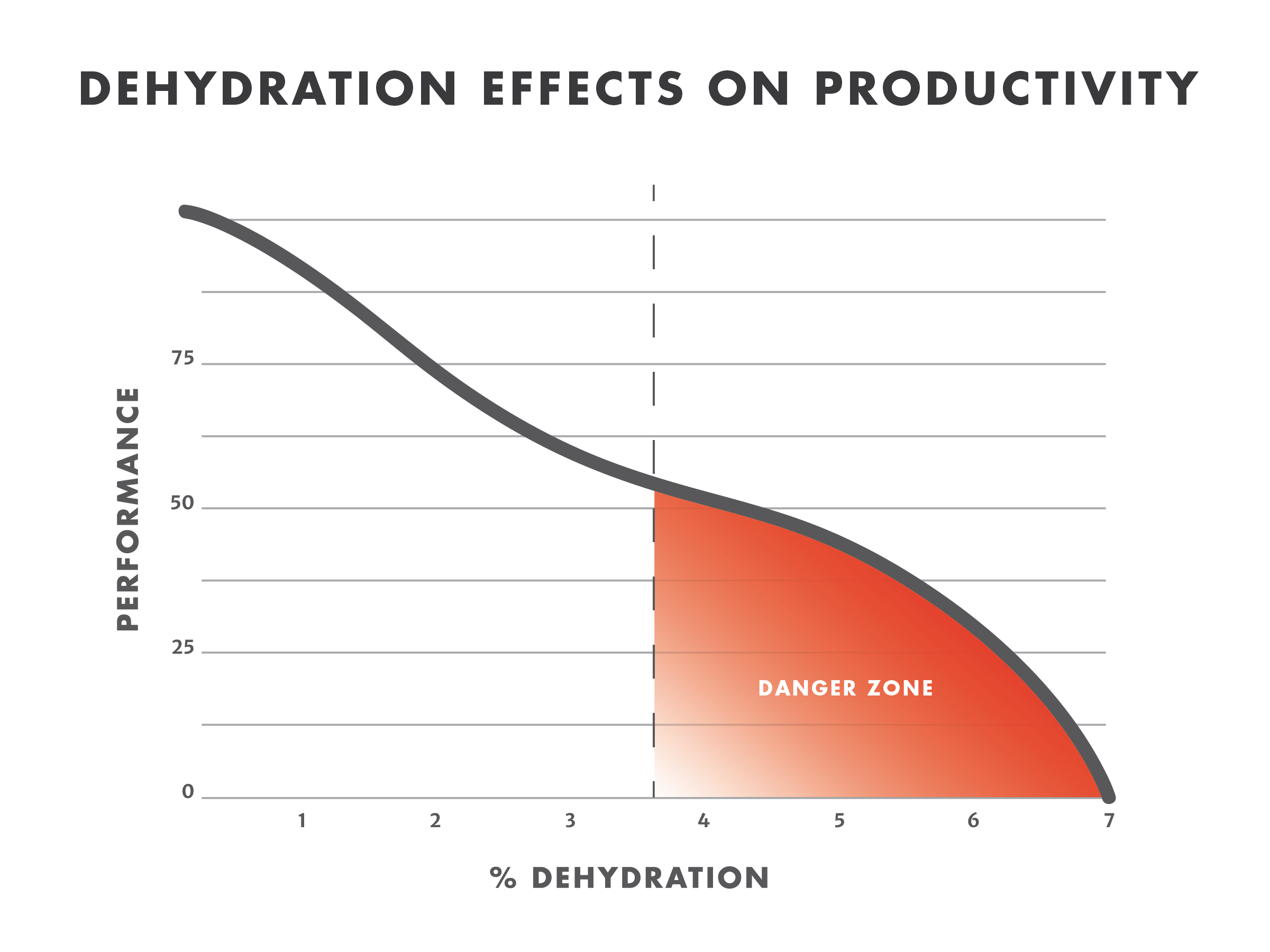 1% dehydration affects workers productivity by 12%, 2% dehydration raises your heart rate by 5%, 3% dehydration can reduce cardiac output by 20%.